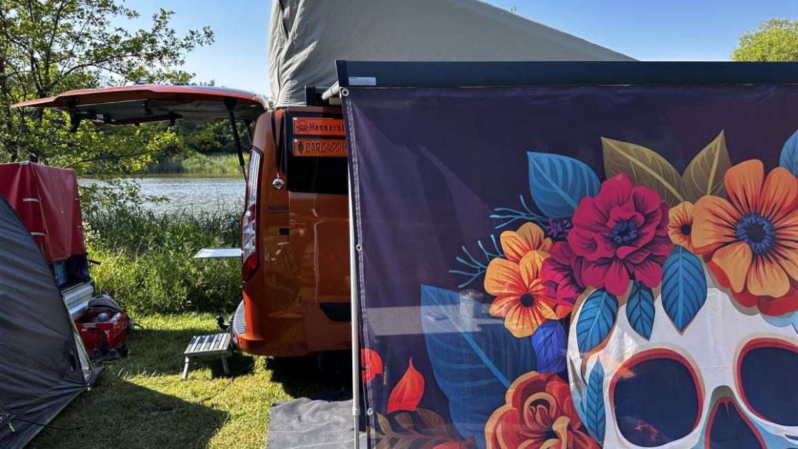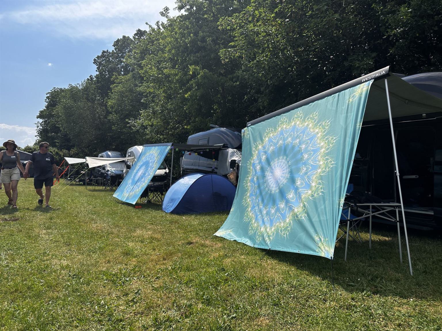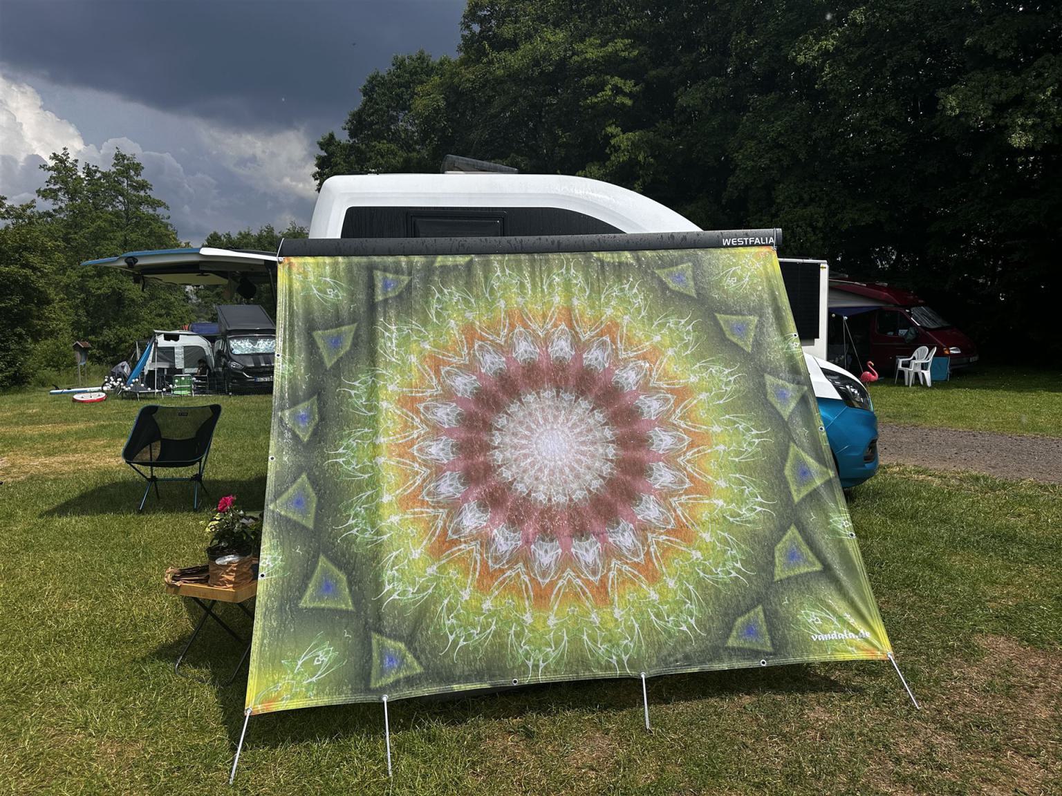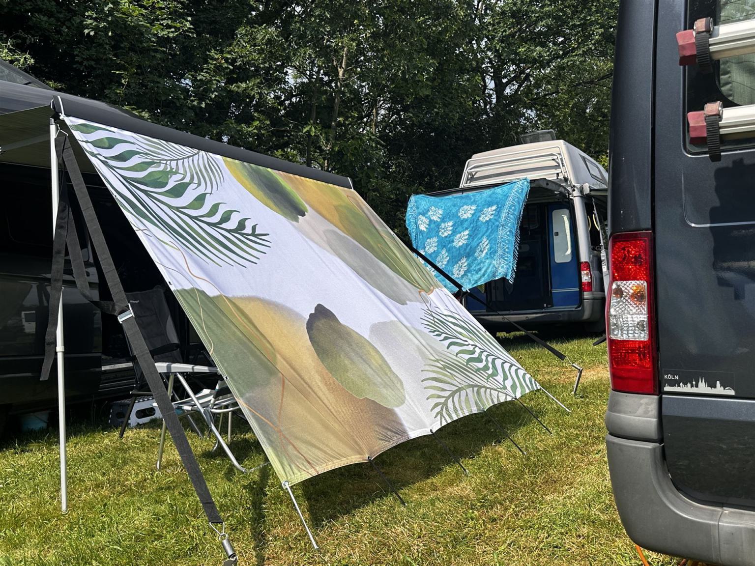 Im Mittelpunkt des fünftägigen Festivals »Nuggets & Friends« (Mi 7. bis So 11. Juni 2023) stand ebendieser – in allen Altersklassen, Formen und Farben. Die Goldstücke kamen aus Berlin, Freiburg, Lübeck, Köln und von noch viel, viel weiter her. Manche reisten sogar aus den Niederlanden oder der Schweiz an, um dabei zu sein. Denn eins ist klar: Ein Lächeln hier, ein bisschen Fachsimpeln da – wenn sich Nugget-Freunde treffen, dauert es meist nicht lange, bis man gesellig beisammensitzt oder bei geöffneter Heckklappe den neuesten Umbau bestaunt. Wir fahren selbst ein so geiles Geschoss. Und wie viele von euch vielleicht wissen, haben wir das Ur-VANDALA eigens für die Markise unseres Ford Nugget entwickelt. Und später auch für die Markisen unserer Freunde und Freundesfreunde. Und so verwunderte es auch nicht weiter, dass bereits zu Festival-Beginn das eine oder andere bekannte Tuch gesichtet wurde. Da waren z. B. Susanne mit dem Klassiker Integrität Original, Willi mit seinem WorldWideWilli oder CaroMarco und ihr Rock'n'Roll.