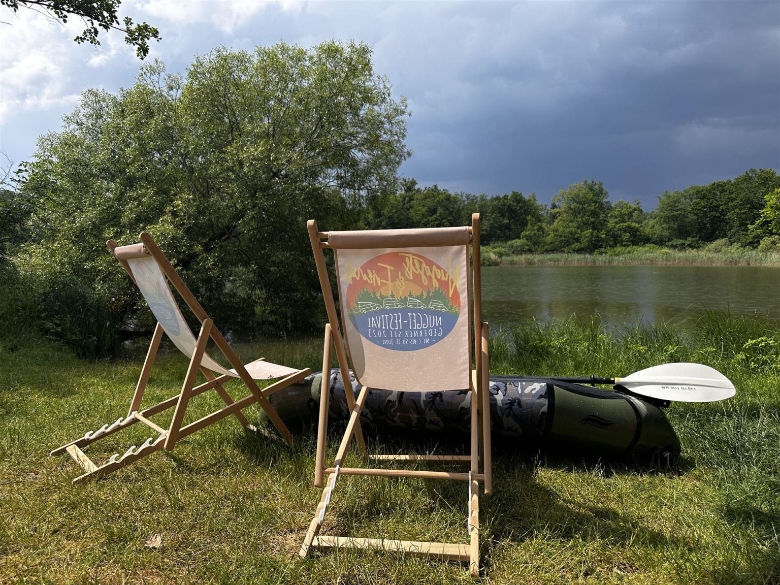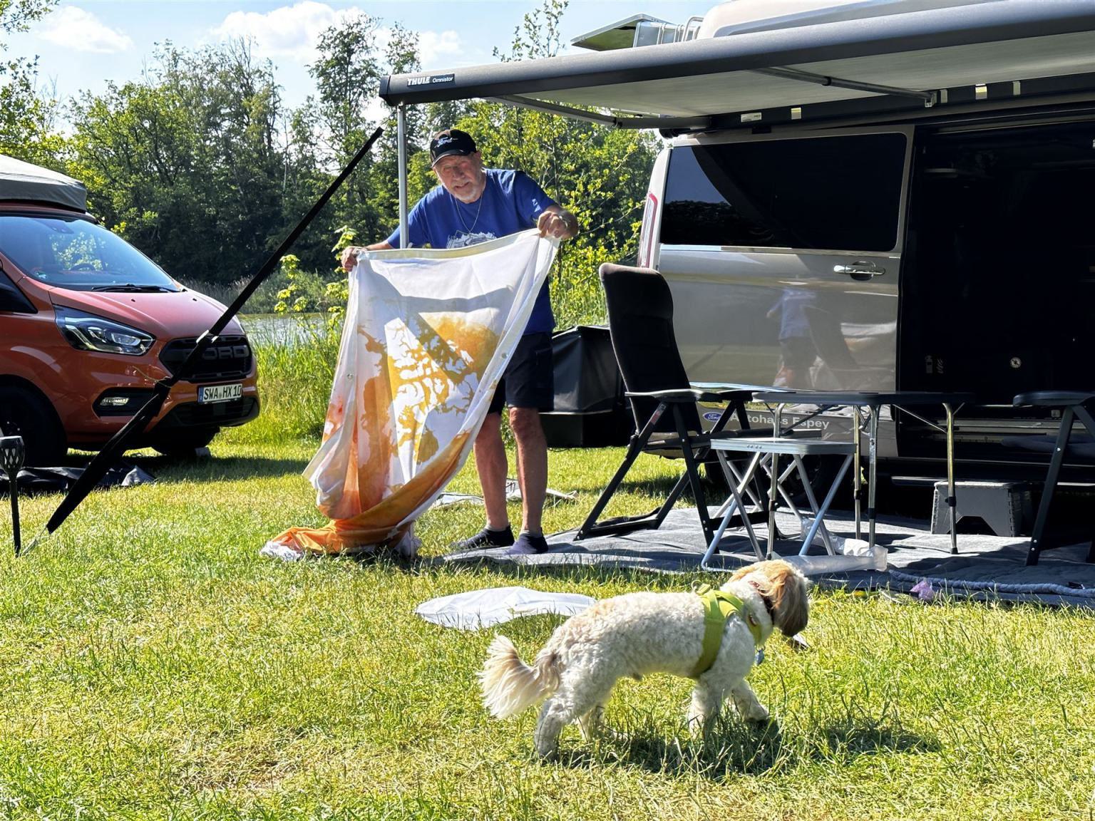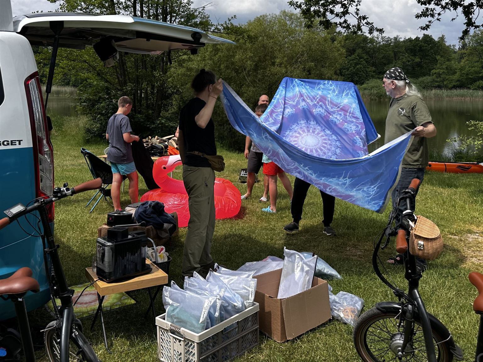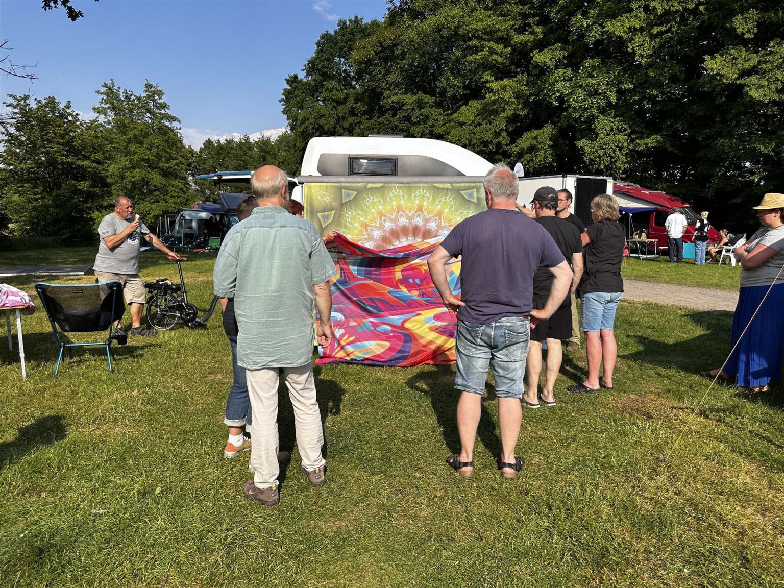 Im Mittelpunkt des fünftägigen Festivals »Nuggets & Friends« (Mi 7. bis So 11. Juni 2023) stand ebendieser – in allen Altersklassen, Formen und Farben. Die Goldstücke kamen aus Berlin, Freiburg, Lübeck, Köln und von noch viel, viel weiter her. Manche reisten sogar aus den Niederlanden oder der Schweiz an, um dabei zu sein. Denn eins ist klar: Ein Lächeln hier, ein bisschen Fachsimpeln da – wenn sich Nugget-Freunde treffen, dauert es meist nicht lange, bis man gesellig beisammensitzt oder bei geöffneter Heckklappe den neuesten Umbau bestaunt. Wir fahren selbst ein so geiles Geschoss. Und wie viele von euch vielleicht wissen, haben wir das Ur-VANDALA eigens für die Markise unseres Ford Nugget entwickelt. Und später auch für die Markisen unserer Freunde und Freundesfreunde. Und so verwunderte es auch nicht weiter, dass bereits zu Festival-Beginn das eine oder andere bekannte Tuch gesichtet wurde. Da waren z. B. Susanne mit dem Klassiker Integrität Original, Willi mit seinem WorldWideWilli oder CaroMarco und ihr Rock'n'Roll.