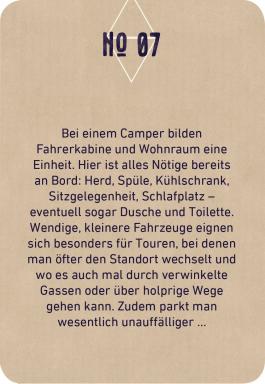 Getreu dem Motto »Lieber 1000 Sterne am Himmel als fünf an der Hoteltür« gibt es vieles, was das Reisen mit einem Camper so faszinierend macht. Mit »Camper-Lifehacks! Der perfekte Roadtrip« wollen wir, Corinna & Oliver von autormobil.de, dich mit auf Entdeckungsreise nehmen. Wochenlang haben wir all die Tipps & Tricks gesammelt, von denen wir glauben, dass sie für Camping-Neulinge von besonderem Interesse sind. Herausgekommen sind 50 handliche Karten im Reiseformat – für alle, die sich ins große (oder auch erst mal kleine) Abenteuer stürzen wollen.