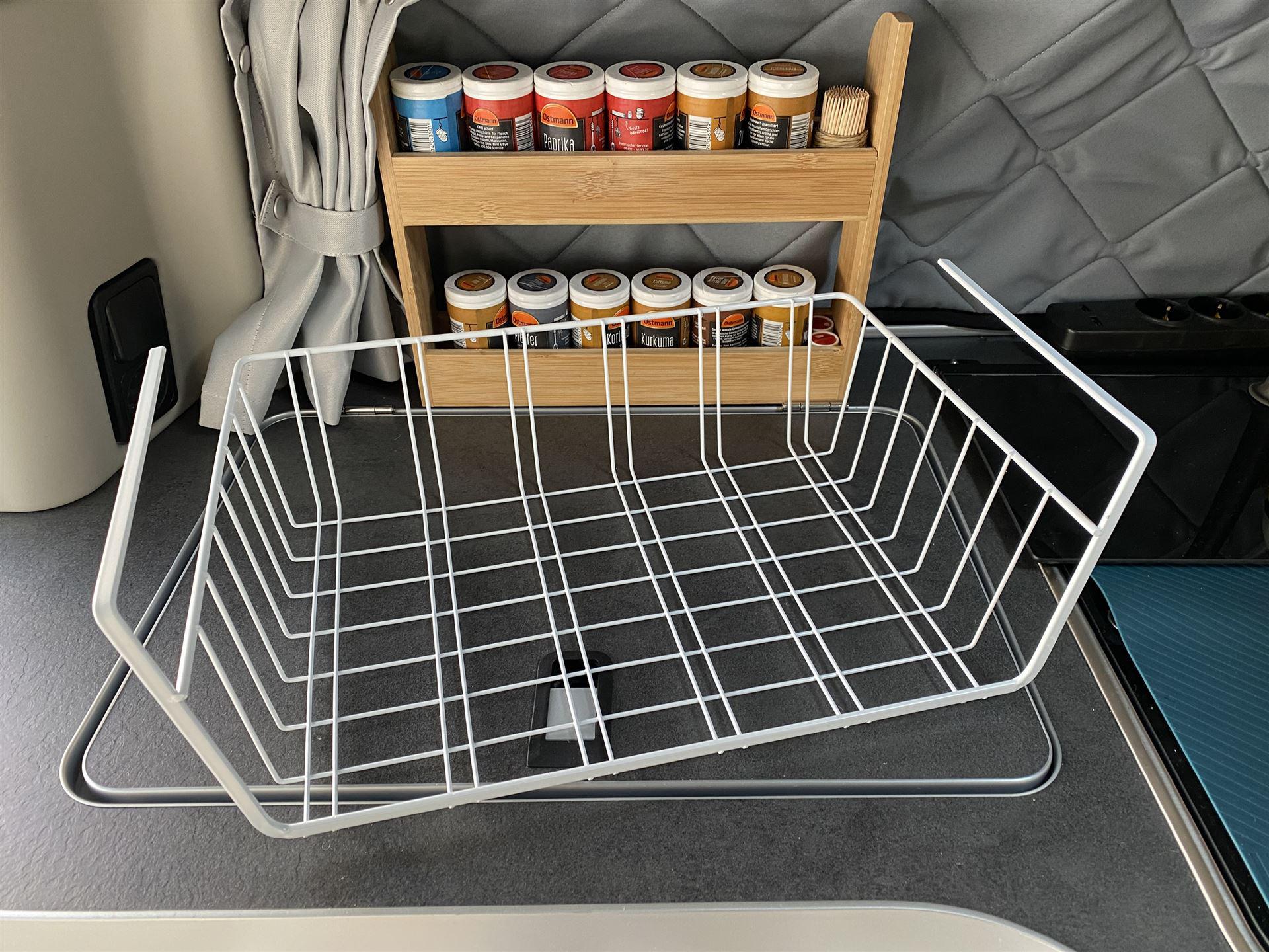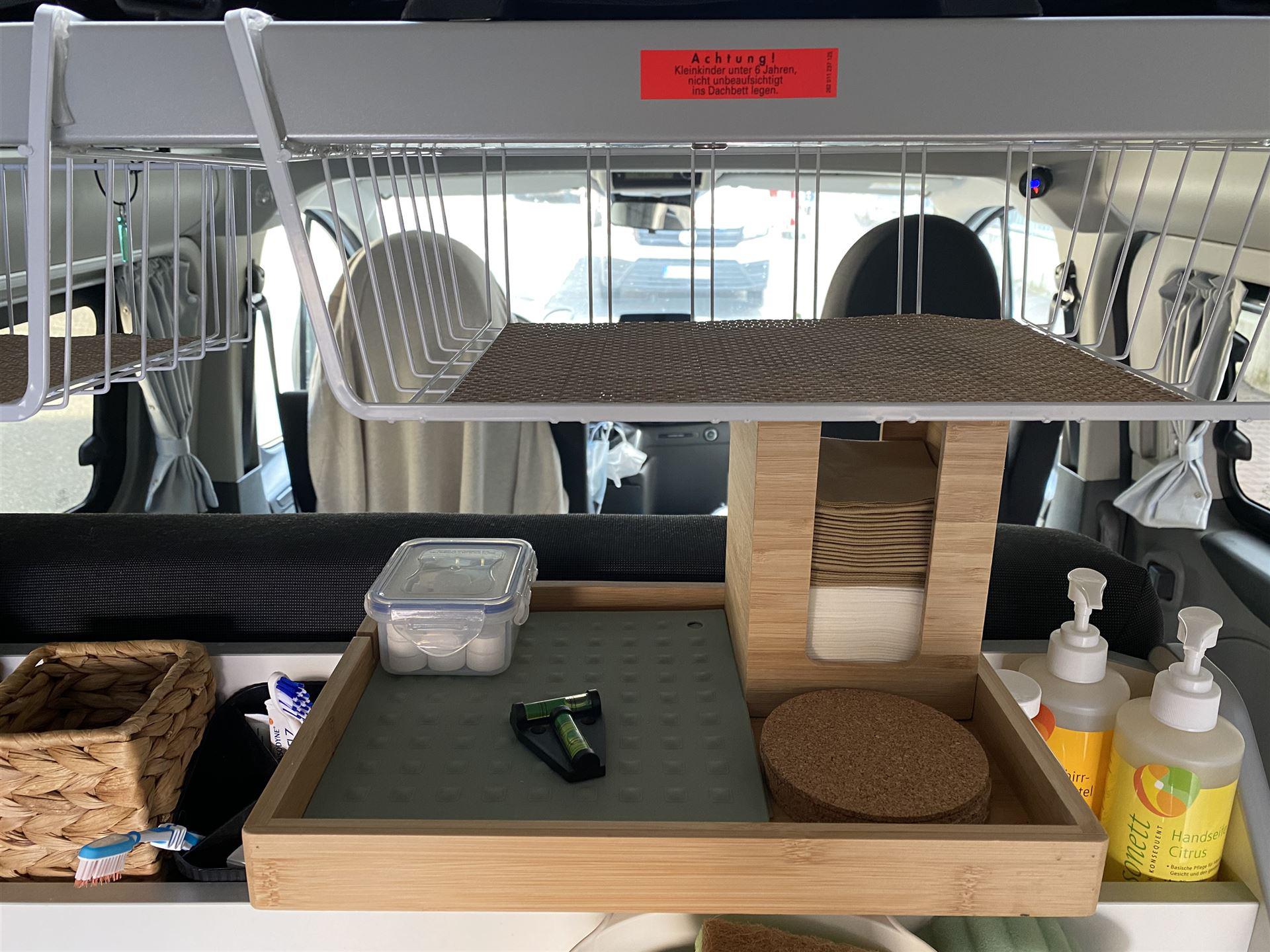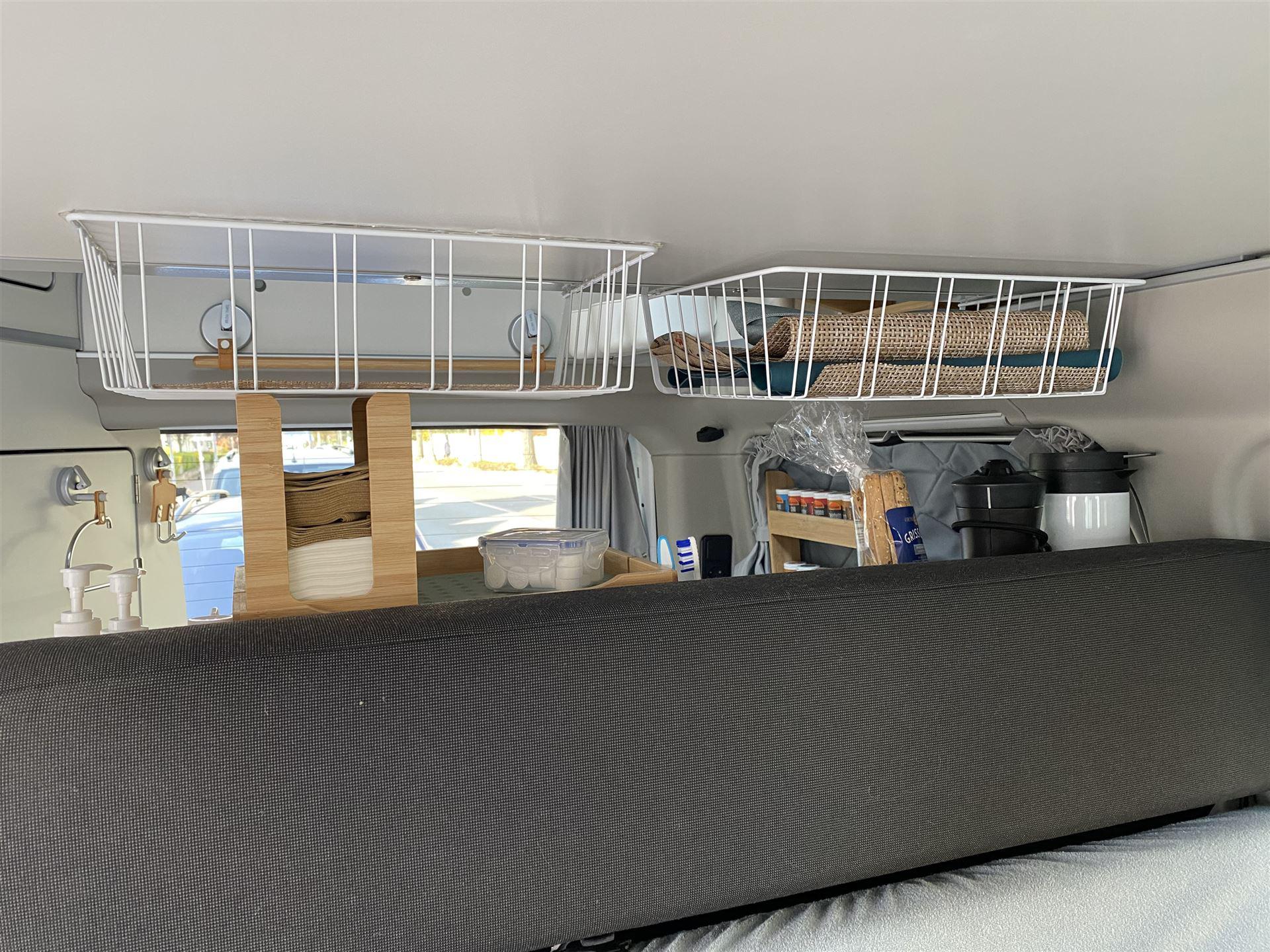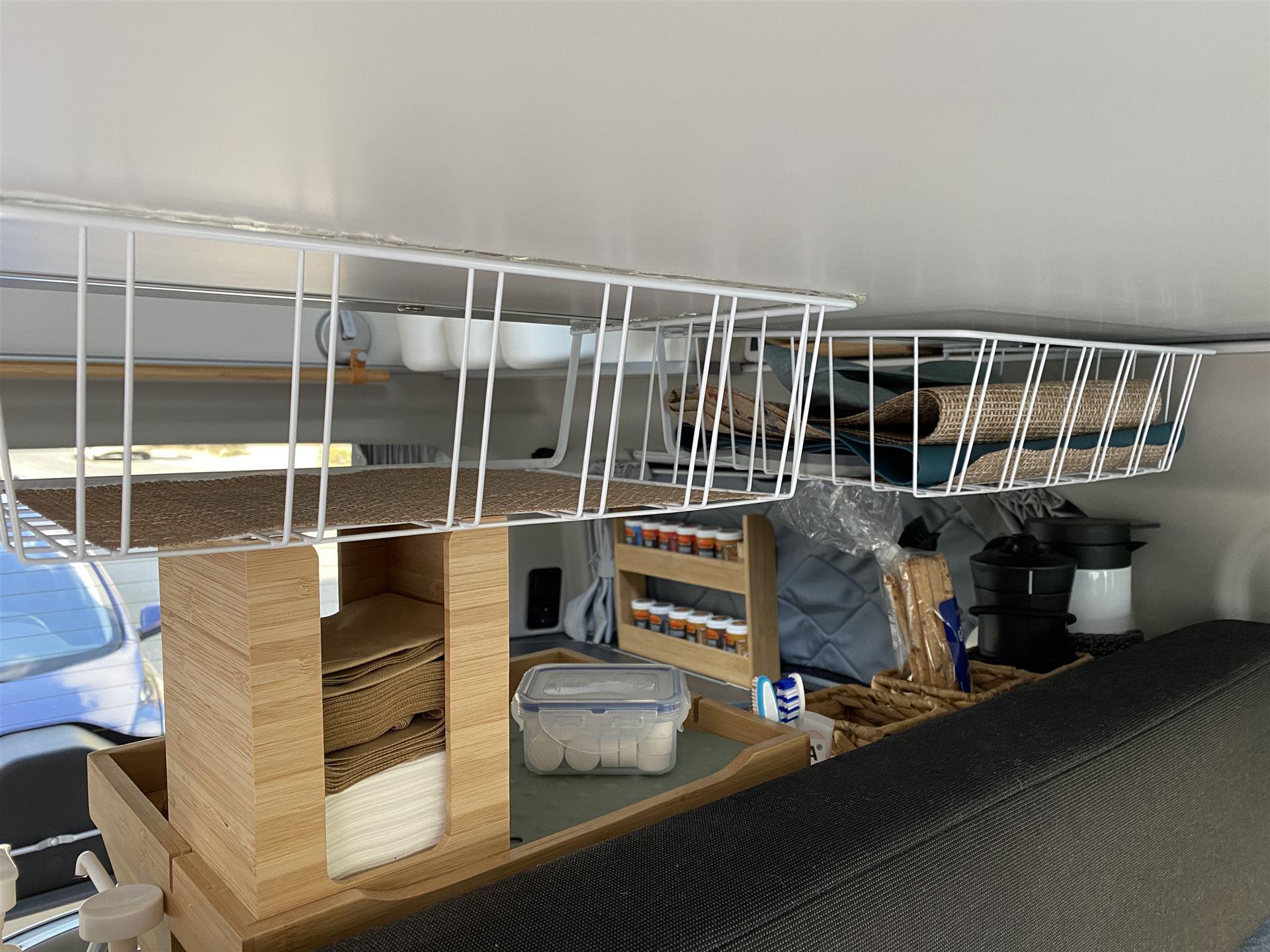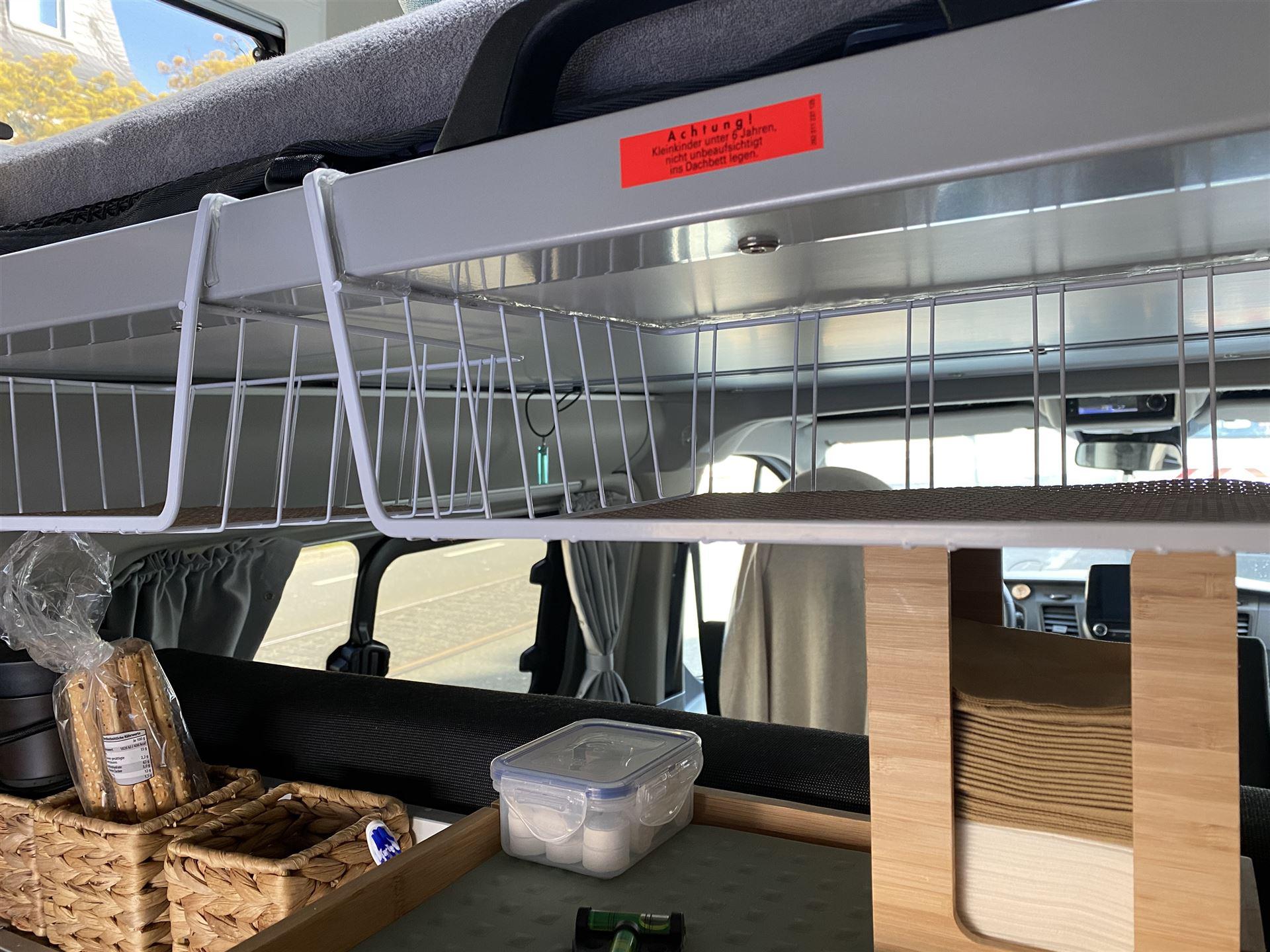Wir sind Hochdachfahrer mit stets ausgeklapptem Bett. Und so kam ich irgendwann auf die Idee mit dem zusätzlichen Stauraum im Nugget. Hängekörbe sind die Lösung!