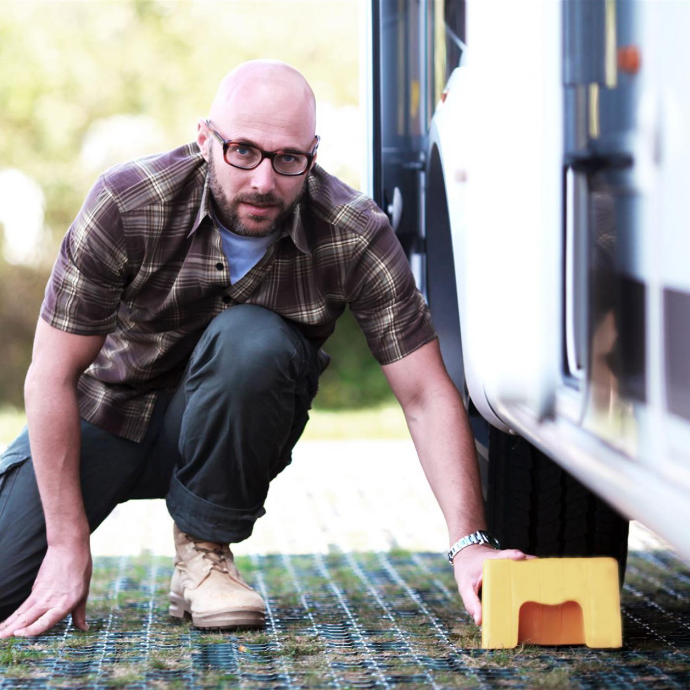 Die Lösung: Besorge dir Auffahrkeile! Diese kannst du nach Bedarf einsetzen und Unebenheiten des Platzes ausgleichen. Eine kleine Wasserwaage hilft dir beim Nivellieren.